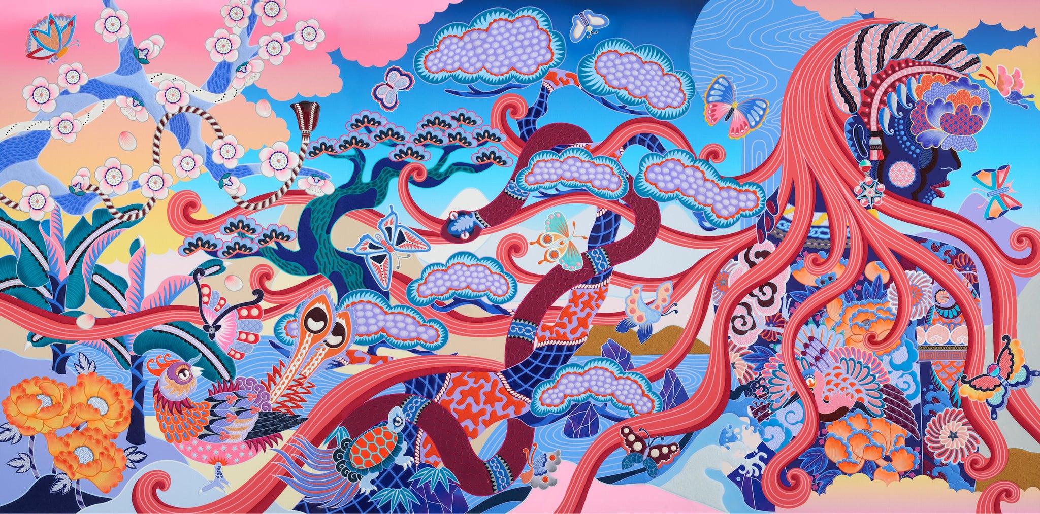 VIEW ALLIn Goddess of Paradise, Kohei has woven together traditional Japanese animal and plant motifs in a garden landscape with a goddess figure’s flowing hair turning into water. All the different shapes and forms that water takes represents the myriad of different hair textures, all beautiful, of the human race. The animals and insects shown in the work are allured by the scents of the plants which call back to the iconic scent of Côte d’Azur.